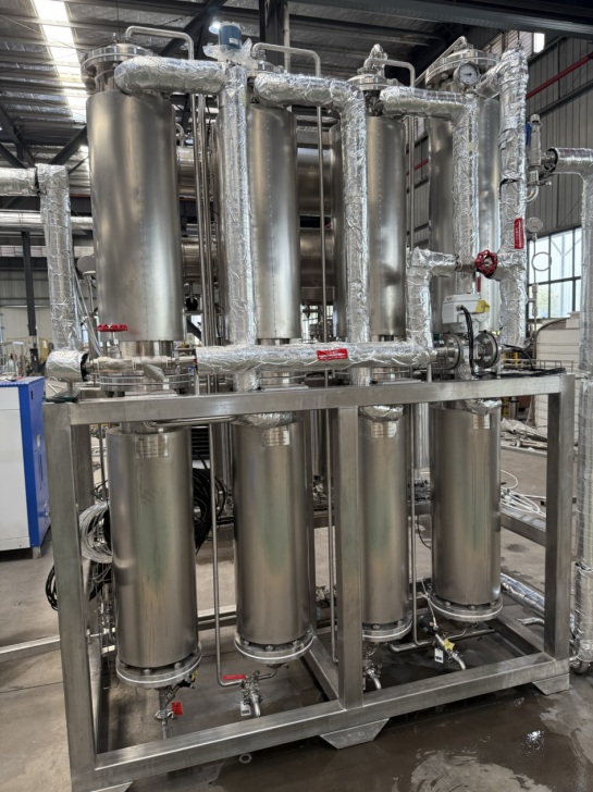 - Multi-Effect Evaporation System: Equipped with shell-and-tube evaporative heat exchangers made of 316L stainless steel, the system heats purified water into pure steam through multi-effect heat recovery technology, which is then condensed into high-purity distilled water. It can deeply remove dissolved salts, pyrogens, microorganisms, and endotoxins from water, with the produced water’s conductivity stably ≤0.1μS/cm, meeting the stringent requirements of the pharmaceutical industry for water for injection.